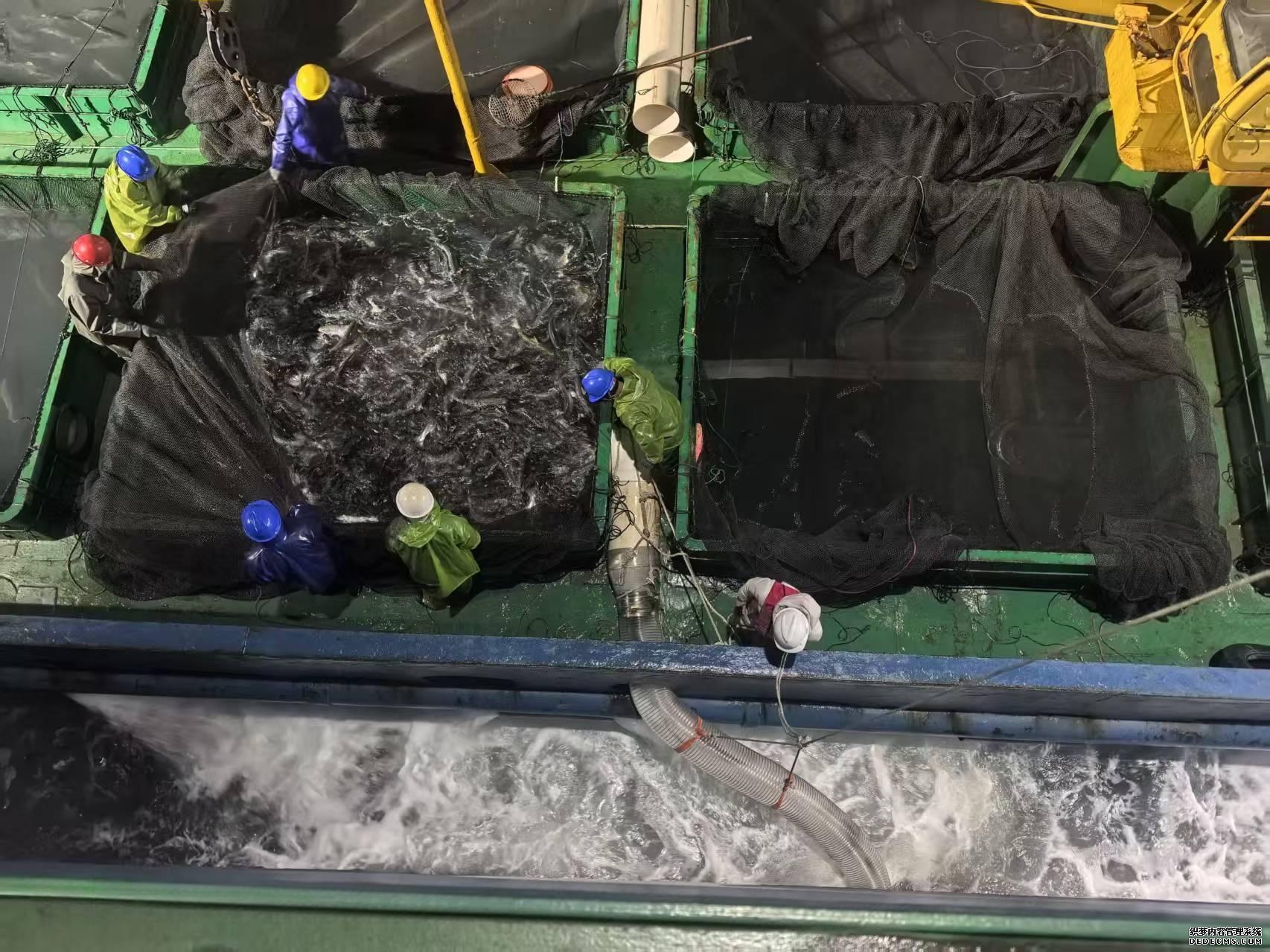 据悉,本次入舱作业历时两天,共成功入舱大西洋鲑鱼苗2.5万余尾。面对海上风浪较大的复杂环境,现场团队灵活应对,精心组织,采用吊装和侧舷滑道入舱相结合的方式,鱼苗运输和入舱过程的成活率高达99.7%,展现了工船养殖模式的高效与可靠。