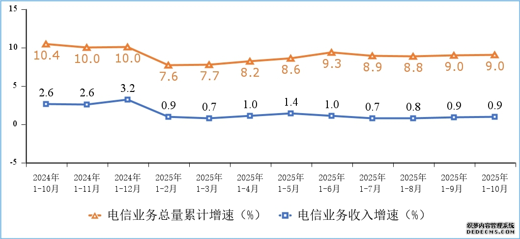 据工业和信息化部网站消息,工信部发布2025年前10个月通信业经济运行情况。 前10个月,通信业运行总体平稳。电信业务量收保持增长,新型基础设施建设有序推进,5G、千兆、物联网等用户规模持续扩大,移动互联网接入流量保持较快增长。 一、总体运行情况 电信业务量收平稳增长。前10个月,电信业务收入累计完成14670亿元,同比增长0.9%。按照上年不变价计算的电信业务总量同比增长9%。
