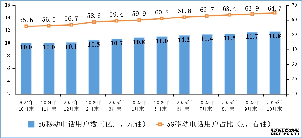 5G移动电话用户情况 图片均来自工业和信息化部网站 移动物联网终端用户较快增长,互联网电视(IPTV、OTT)稳步增加。截至10月末,三家基础电信企业发展移动物联网终端用户28.9亿户,比上年末净增2.34亿户。互联网电视(IPTV、OTT)用户数达4.12亿户,比上年末净增473.7万户。 三、电信业务使用情况 移动互联网流量保持较快增势,10月DOU值创新高。前10个月,移动互联网累计流量达3232亿GB,同比增长16.8%。截至10月末,移动互联网用户数达16.17亿户,比上年末净增4642万户。10月当月户均移动互联网接入流量(DOU)达到22.21GB/户·月,同比增长15.7%,比上年底高2.51GB/户·月。 电话通话量持续下滑,移动短信业务收入小幅下降。前10个月,移动电话去话通话时长完成1.7万亿分钟,同比下降5.2%;固定电话主叫通话时长完成560.4亿分钟,同比下降14.1%。前10个月,全国移动短信业务量同比增长18.8%;移动短信业务收入同比下降1.2%。 四、通信能力情况 千兆网络接入能力持续提升。截至10月末,全国互联网宽带接入端口数量达12.43亿个,比上年末净增4089万个。其中,光纤接入(FTTH/O)端口达到12.02亿个,比上年末净增4213万个,占互联网宽带接入端口的96.7%。截至10月末,具备千兆网络服务能力的10G 5G网络建设有序推进。截至10月末,5G基站总数达475.8万个,比上年末净增50.7万个,占移动基站总数的37%,占比前三季度提高0.4个百分点。 五、地区发展情况 各地区千兆、5G用户发展较快。截至10月末,东、中、西部和东北地区1000Mbps及以上固定宽带接入用户渗透率分别为34.1%、33.5%、36.2%和27.8%,较上年末分别提升2.9个、2.3个、4.5个和4.2个百分点;5G移动电话用户渗透率分别为64.3%、65.4%、64.6%、65.3%,较上年末分别提升7.6个、8.2个、8.3个和9个百分点。 各地区移动互联网接入流量增速保持两位数水平。前10个月,东、中、西部和东北地区移动互联网接入流量分别达到1357亿GB、761.1亿GB、921亿GB和193.4亿GB,同比增长17.3%、16.1%、15.2%和25.1%。 (责任编辑:admin) |